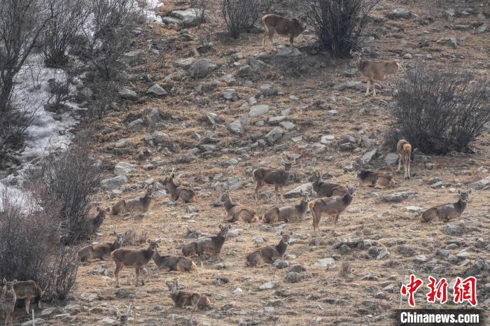 圖為林周縣境內(nèi)的白唇鹿。貢嘎來松 攝