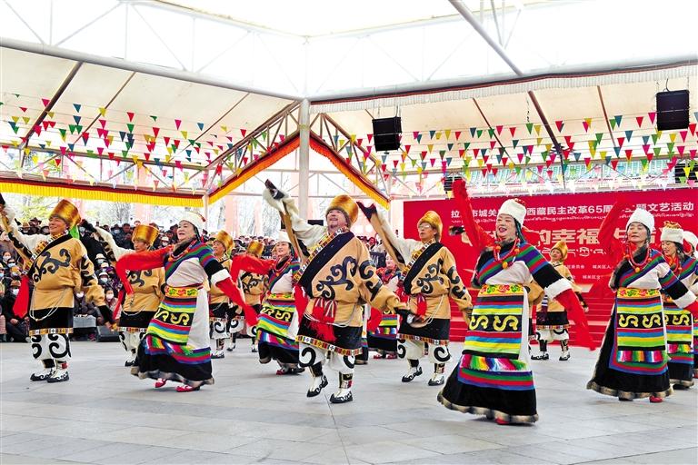 3月25日,由拉薩市城關(guān)區(qū)委、區(qū)政府主辦,城關(guān)區(qū)委宣傳部承辦的“我們的幸福生活”紀(jì)念西藏民主改革65周年文藝活動,在宗角祿康公園舉行。活動在開場歌舞《美麗的西藏·可愛的家鄉(xiāng)》中拉開序幕,現(xiàn)場觀眾熱情高漲,隨著歌舞旋律的起伏,不時報以熱烈的掌聲。此次文藝活動充分展現(xiàn)了高原各族兒女對中國共產(chǎn)黨、偉大祖國和新時代的感恩之情。城關(guān)區(qū)委宣傳部常務(wù)副部長王全勝表示:“通過搭建文藝演出平臺,各族群眾能夠一展才藝、分享幸福生活,讓大家零距離參與文化活動,既豐富了人民群眾的精神文化生活,又激發(fā)了大家共建幸福新西藏的熱情?!?/p>