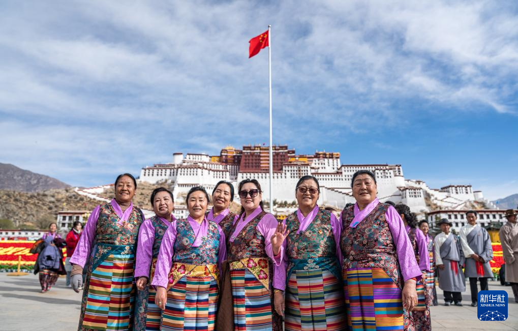 3月28日,人們?cè)诓歼_(dá)拉宮廣場(chǎng)參加升旗儀式后合影留念。新華社記者 丁增尼達(dá) 攝