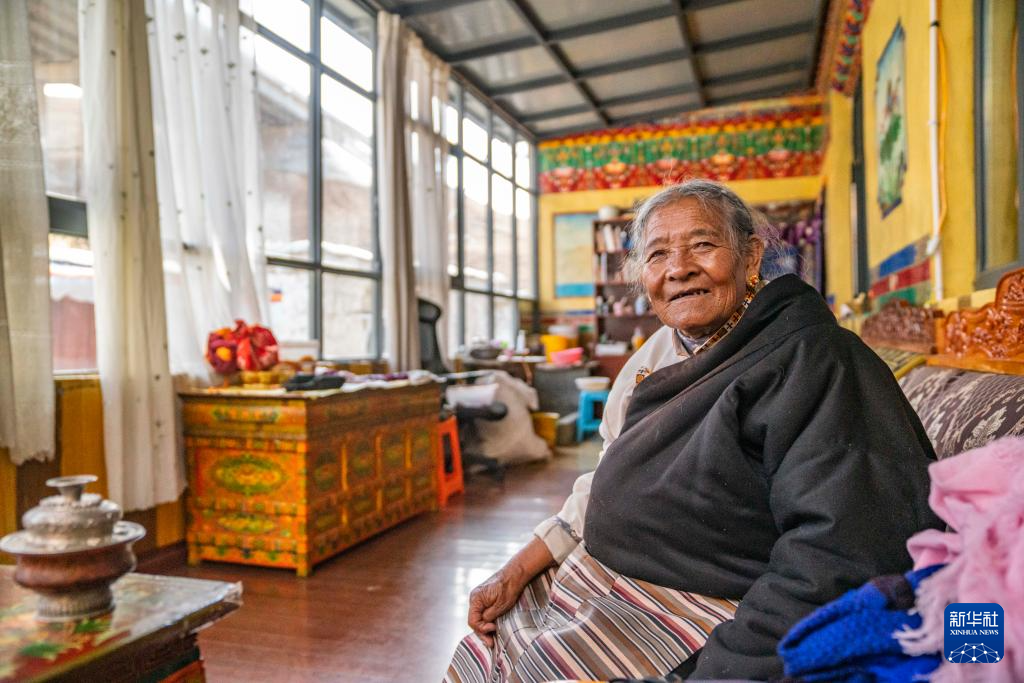 2024年藏歷新年,斯曲旺姆的兒女們帶著各自的小家庭來甲根村團(tuán)聚,孩子們依次給老人獻(xiàn)上哈達(dá)、敬上青稞酒。斯曲旺姆被滿堂兒孫圍坐中間,歡歌笑語回蕩在明亮寬敞的客廳里。