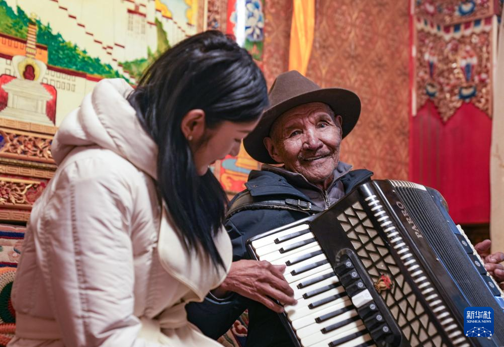 朗杰(右)指導(dǎo)孫女索朗曲珍拉手風(fēng)琴(3月13日攝)。新華社記者 晉美多吉 攝