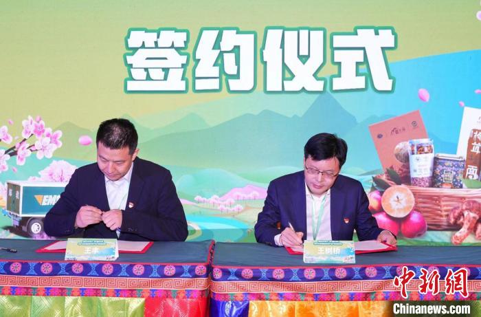 圖為中國郵政集團有限公司西藏自治區(qū)分公司黨委書記、總經理王樹橋(圖右)與西藏供銷集團董事長王豐簽約。中國郵政集團有限公司林芝市分公司供圖。