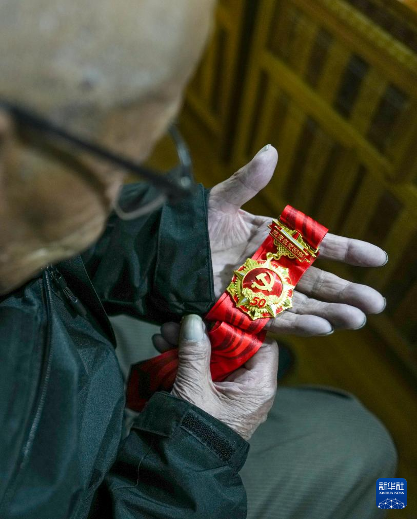 益西桑珠查看自己視為珍寶的“光榮在黨50年”紀(jì)念章(3月13日攝)。新華社記者 晉美多吉 攝