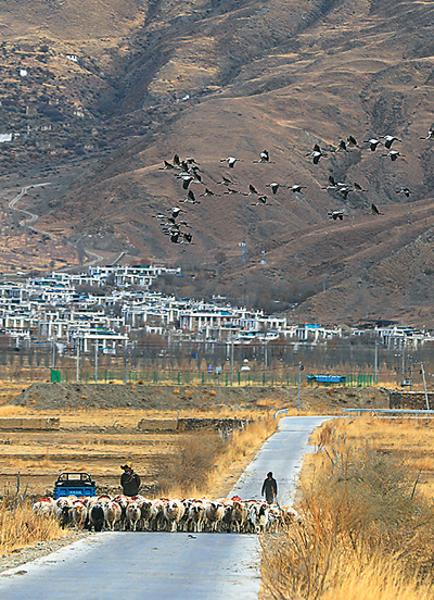黑頸鶴群飛過(guò)西藏山南市貢嘎縣杰德秀鎮(zhèn)村莊和羊群。益西旦增攝