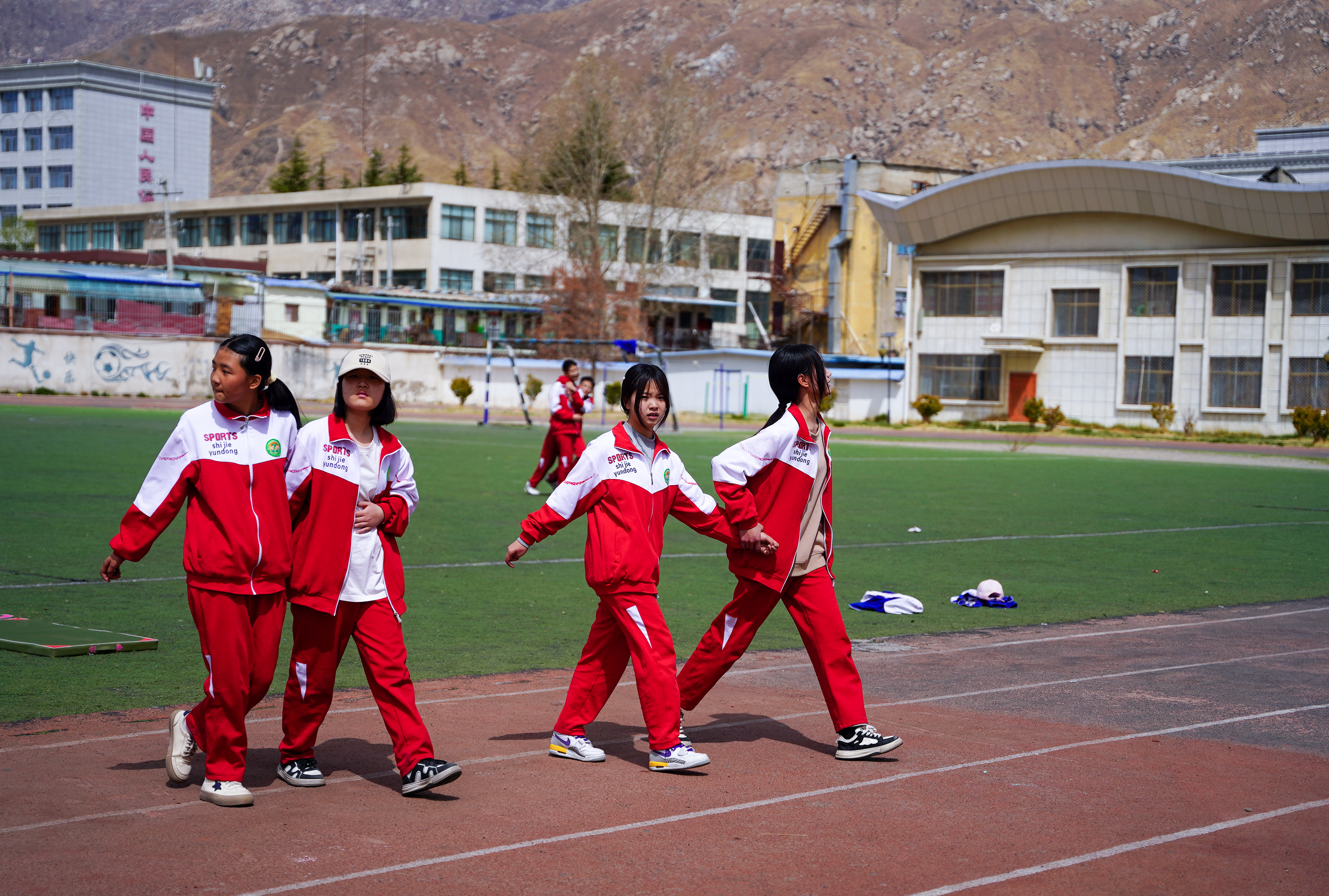 課間一起漫步在校園的學生。