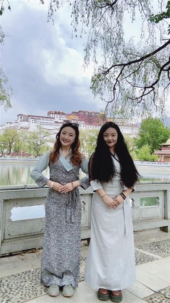八廓街內(nèi),布宮圍墻邊,帕崩崗桃花樹下……游走在拉薩各個(gè)景點(diǎn),你會(huì)發(fā)現(xiàn)眾多身著藏裝的漂亮姑娘,她們大多是來自全國各地的游客。藏裝布料精美、顏色亮麗,樣式傳統(tǒng)或新穎,配上頭飾耳飾,衣香鬢影、搖曳生姿。她們穿著藏裝賞景、拍照留念,亦成為別人眼中的風(fēng)景。