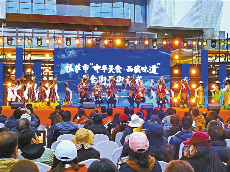 5月2日,拉薩印“中華美食·西藏味道”美食街開(kāi)街,市民、游客觀看藏戲表演。記者 劉斯宇 盧文靜 攝