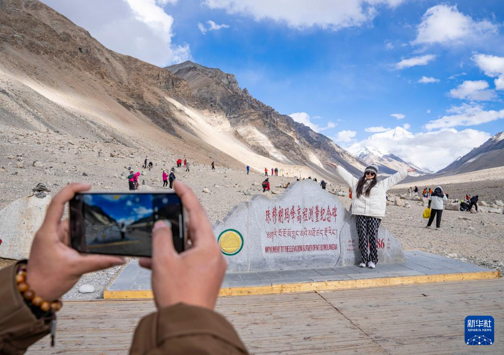 游客在珠穆朗瑪峰高程測量紀(jì)念碑前拍照留念(5月24日攝)。
