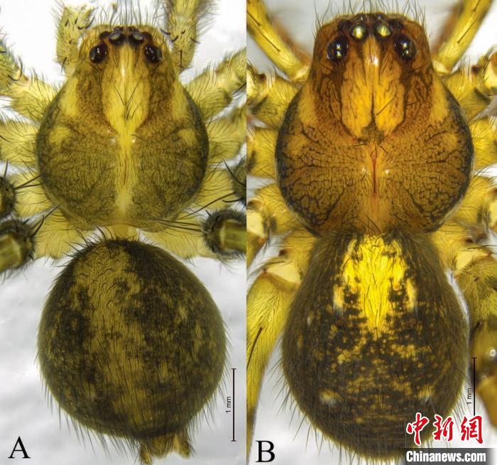 圖為錯(cuò)那侵蛛雄蛛外形背面觀(A),雌蛛外形背面觀(B)。王露雨 攝