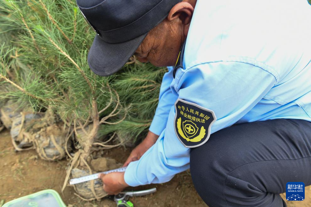 6月3日,在拉薩南北山綠化工程2024年度鞏固提升(貢嘎機(jī)場周邊山體)工程項(xiàng)目上,林業(yè)檢疫執(zhí)法工作人員在檢查樹苗根部土球是否達(dá)標(biāo)。新華社記者 晉美多吉 攝