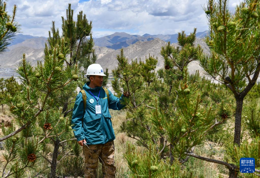 6月3日,拉薩南北山綠化工程2024年度鞏固提升(貢嘎機(jī)場周邊山體)工程項(xiàng)目上,第三方監(jiān)理人員在檢查樹木狀況。新華社記者 晉美多吉 攝