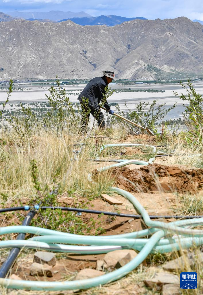 6月3日,在拉薩南北山綠化2024年度一期工程貢嘎縣造林項(xiàng)目貢嘎2號(hào)片區(qū),當(dāng)?shù)卮迕裨谠詷湓炝?。新華社記者 晉美多吉 攝