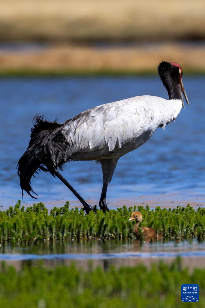 6月9日,一對(duì)黑頸鶴夫婦帶著雛鳥在西藏那曲市申扎縣一處濕地棲息、覓食。新華社記者 旦增尼瑪曲珠 攝