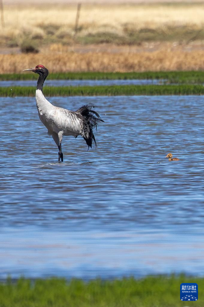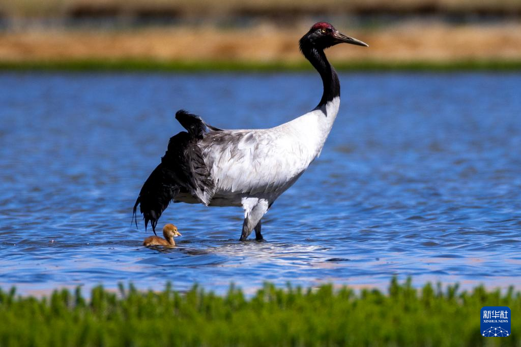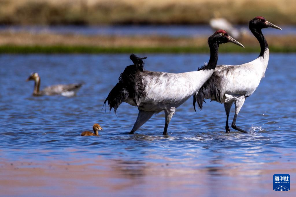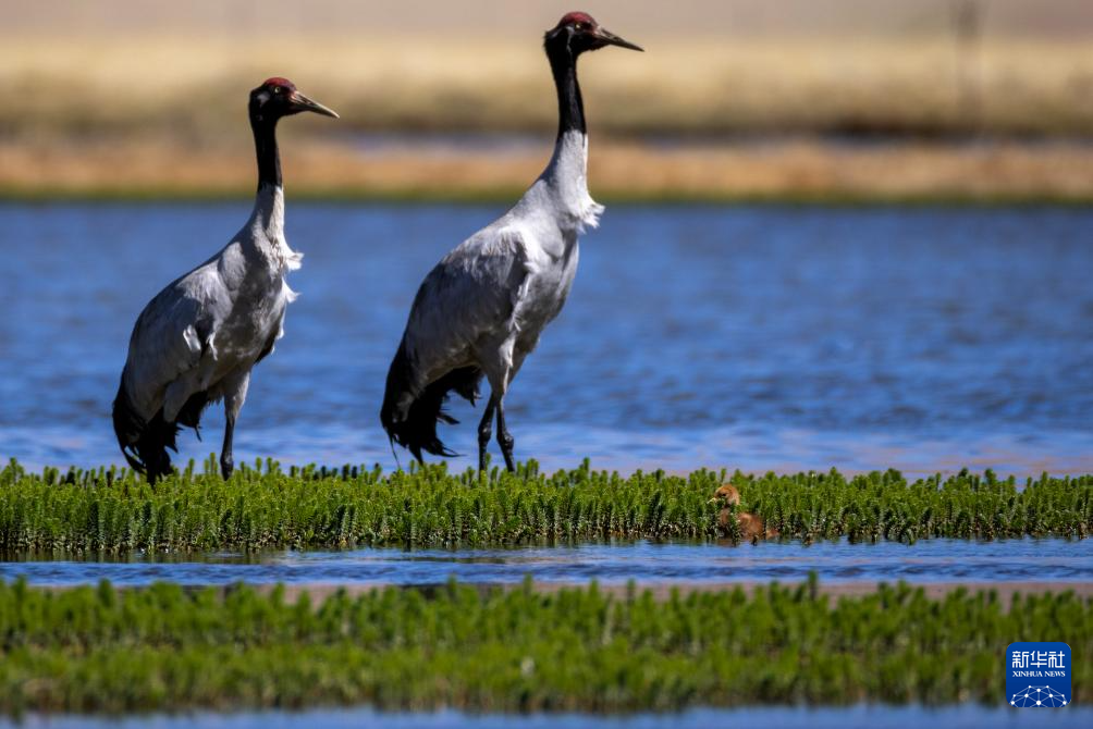 6月9日,一對(duì)黑頸鶴夫婦帶著雛鳥在西藏那曲市申扎縣一處濕地棲息、覓食。新華社記者 晉美多吉 攝