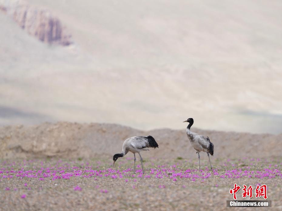 6月12日,西藏那曲市申扎縣黑頸鶴在花叢中覓食。申扎縣,平均海拔超過4500米,是黑頸鶴在中國的主要繁殖地之一。每年4月到6月,成群的黑頸鶴會來到這里,筑巢、孵化、養(yǎng)育下一代。近年來,為了保護這些珍貴的生靈,申扎縣采取了一系列措施,設立了監(jiān)測站,對黑頸鶴的棲息地進行24小時監(jiān)控,確保它們的繁殖不受干擾。黑頸鶴是國家一級保護動物,也是世界上唯一一種生長、繁殖在高原的鶴類。貢嘎來松 攝