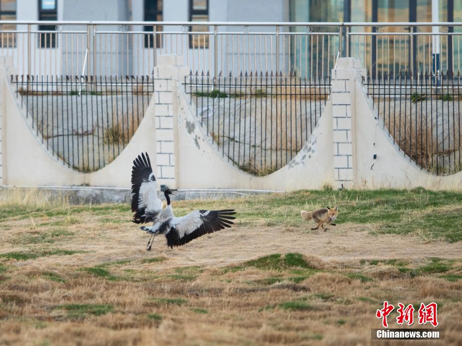 6月12日,西藏那曲市申扎縣濕地里一只黑頸鶴在驅趕狐貍。申扎縣,平均海拔超過4500米,是黑頸鶴在中國的主要繁殖地之一。每年4月到6月,成群的黑頸鶴會來到這里,筑巢、孵化、養(yǎng)育下一代。近年來,為了保護這些珍貴的生靈,申扎縣采取了一系列措施,設立了監(jiān)測站,對黑頸鶴的棲息地進行24小時監(jiān)控,確保它們的繁殖不受干擾。黑頸鶴是國家一級保護動物,也是世界上唯一一種生長、繁殖在高原的鶴類。貢嘎來松 攝