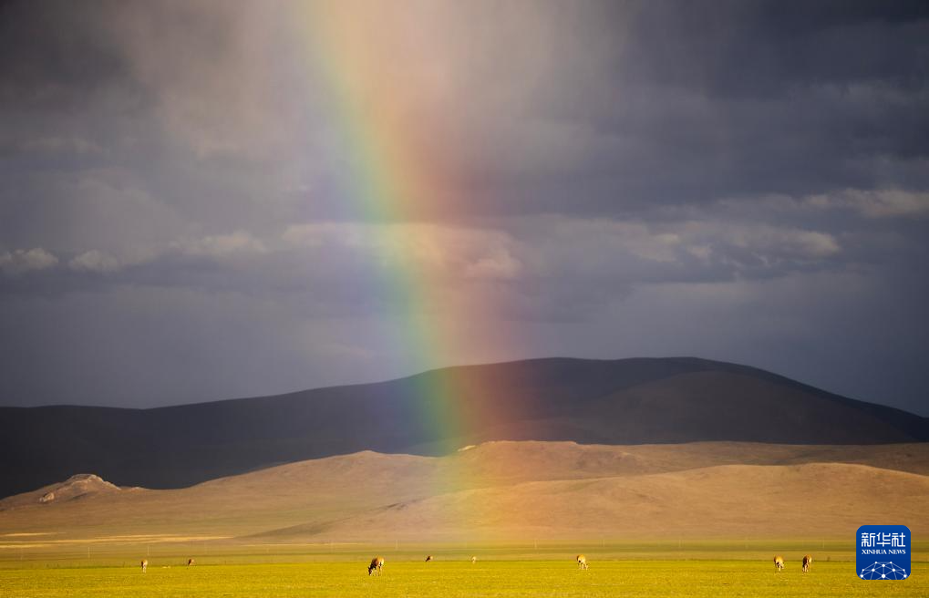 6月16日,彩虹下待產(chǎn)的藏羚羊。新華社記者 費(fèi)茂華 攝