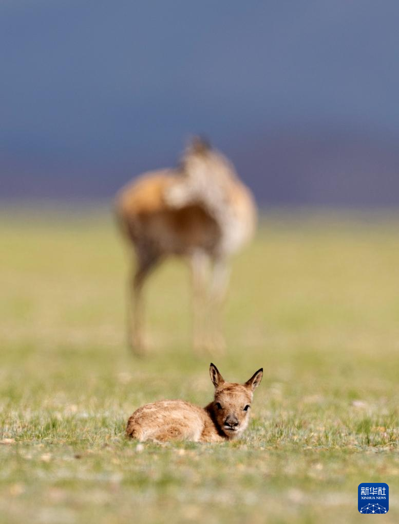 魯確塘草原上,藏羚羊媽媽守護(hù)著剛出生的小藏羚羊(6月16日攝)。新華社記者 旦增尼瑪曲珠 攝