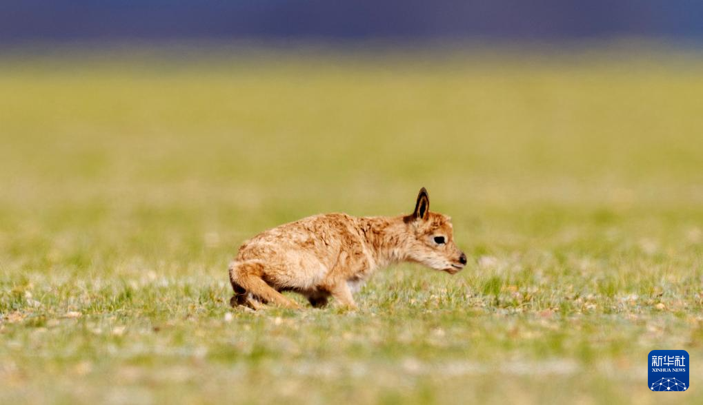 6月17日,在魯確塘草原,一只剛出生不久的小藏羚羊在草地上奔跑。新華社記者 費(fèi)茂華 攝??