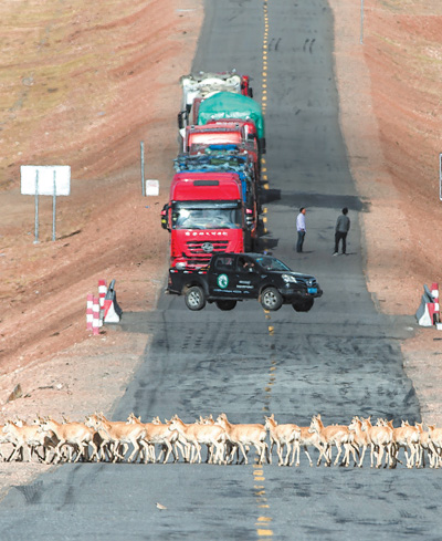 在青藏線上,順利遷徙的藏羚羊群,展現(xiàn)著人與自然和諧共生的生動(dòng)畫(huà)面。