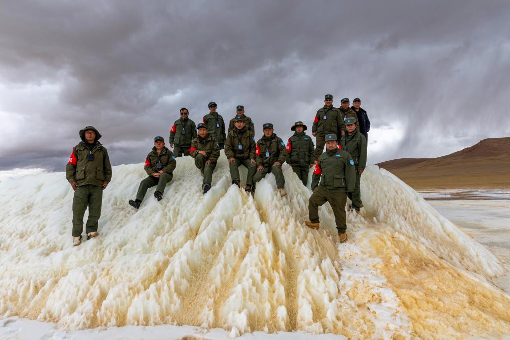 野生動(dòng)物專業(yè)管護(hù)隊(duì)員在巡護(hù)路上一處埡口的冰雪堆上合影(5月7日攝)。新華社記者 姜帆 攝