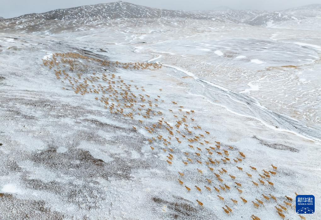 藏羚羊在向產(chǎn)羔地遷徙(無人機(jī)照片,5月10日攝)。新華社記者 姜帆 攝