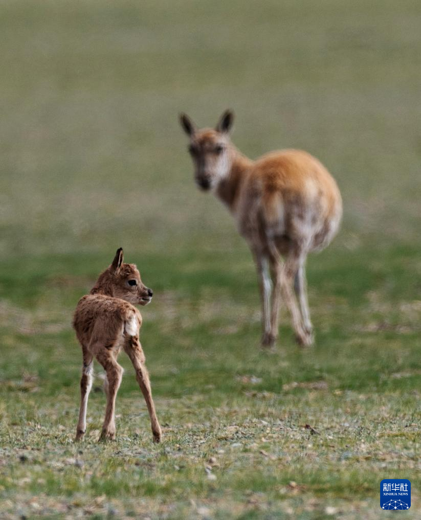 6月17日,在魯確塘草原,一只剛出生不久的小藏羚羊跟著母藏羚羊在草原上漫步。新華社記者 費(fèi)茂華 攝
