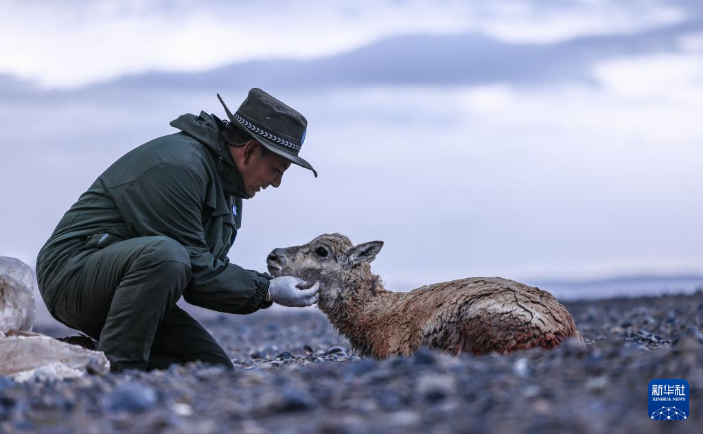 羌塘國(guó)家級(jí)自然保護(hù)區(qū)的野保員在安撫受傷的母藏羚羊(6月14日攝)。新華社發(fā)(旦增攝)