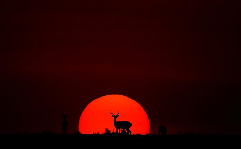 ↑ 在馬賽馬拉國家保護(hù)區(qū),遷徙中的野生動物在夕陽下覓食。