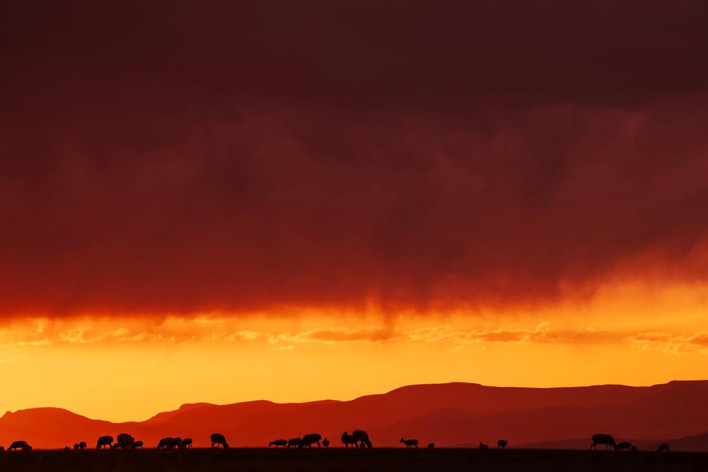 ↑ 在羌塘國家級自然保護(hù)區(qū),藏羚羊在夕陽下覓食。