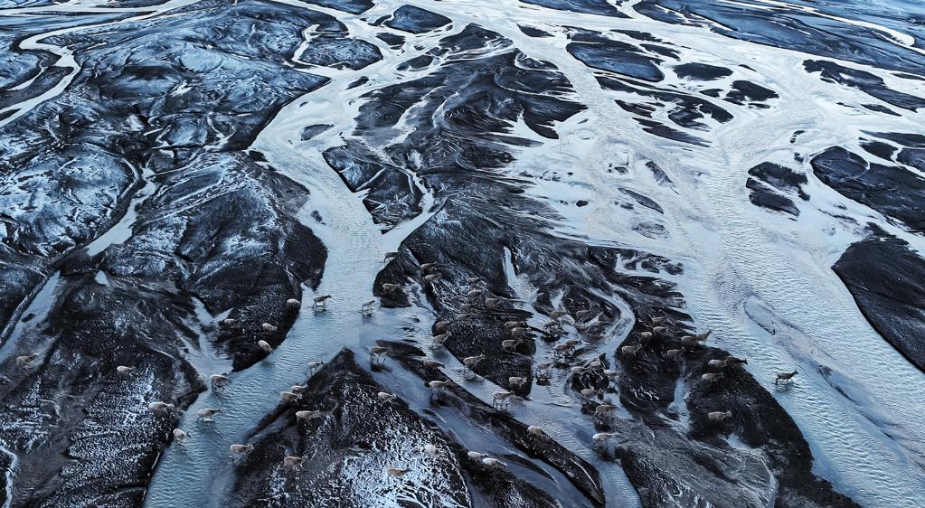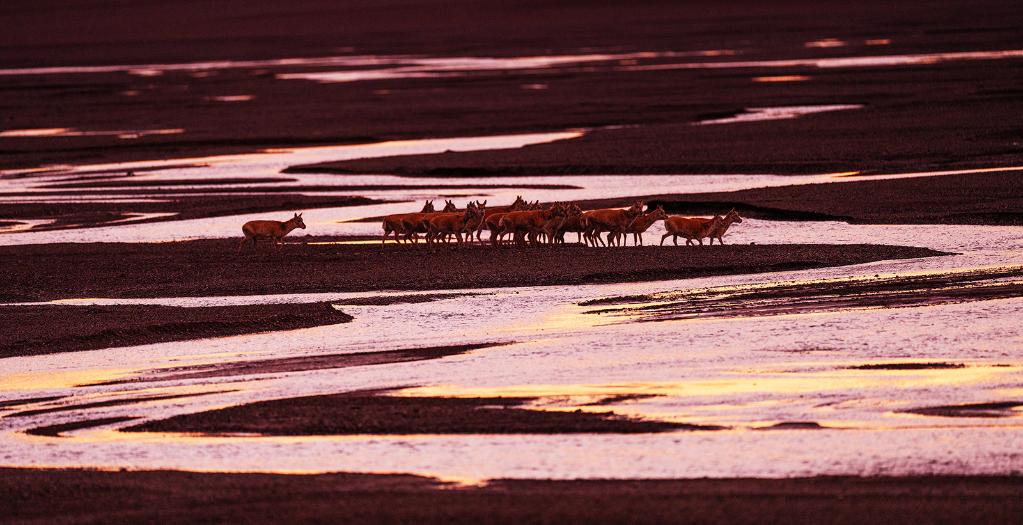 ↑ 在羌塘國家級自然保護(hù)區(qū),藏羚羊越過甜水河,前往“產(chǎn)房”。