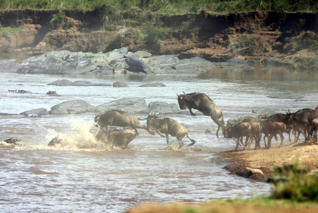 ↑ 在馬賽馬拉國家保護(hù)區(qū),遷徙中的角馬越過馬拉河。