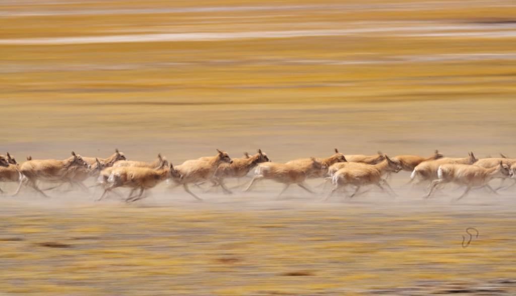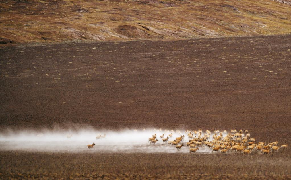 ↑ 在羌塘國家級自然保護(hù)區(qū),遷徙中的藏羚羊因?yàn)楦惺艿轿kU(xiǎn)而奮力奔跑。