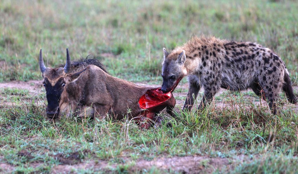 ↑ 在馬賽馬拉國家保護(hù)區(qū),一頭遷徙中的角馬成了鬣狗的食物。在角馬遷徙過程中,獅子、獵豹、花豹、鬣狗以及馬拉河中的鱷魚等掠食動物環(huán)伺其周,伺機(jī)而動。
