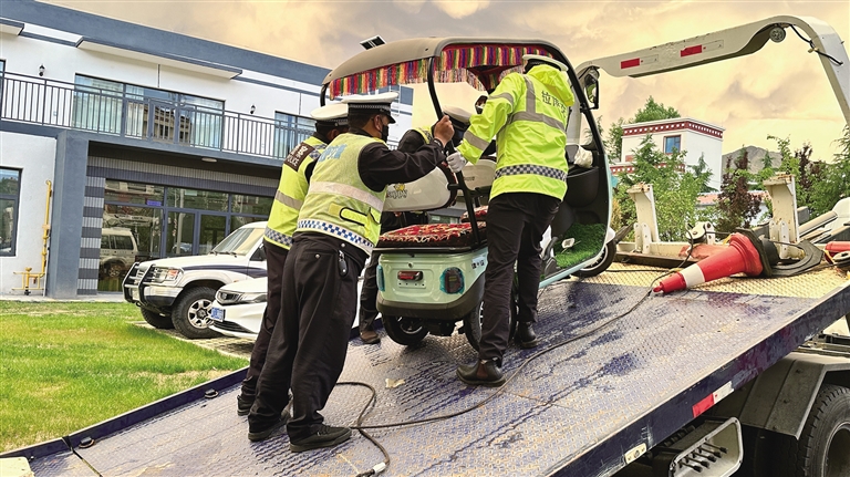 6月19日18時許,記者來到拉薩市城關(guān)區(qū)江蘇東路與嘎瑪貢桑路交叉口,此時正值下班高峰期,各類車輛川流不息,十分繁忙,拉薩市公安局交警支隊城南大隊的民警們一邊疏導(dǎo)交通,一邊開展電動三輪、四輪車專項整治行動。沒過多久,一輛電動三輪車準(zhǔn)備通過路口,民警丹增發(fā)現(xiàn)該車輛存在非法改裝現(xiàn)象,便立即上前將車輛引導(dǎo)至安全位置,檢查后發(fā)現(xiàn)駕駛?cè)怂阶詾檐囕v加裝遮陽篷,上路行駛存在較大安全隱患,便按照相關(guān)法律法規(guī)暫扣車輛。丹增告訴記者:“我們會將暫扣的車輛統(tǒng)一停放,等駕駛?cè)私邮芴幜P并提交相關(guān)資料后,才能領(lǐng)回車輛。”