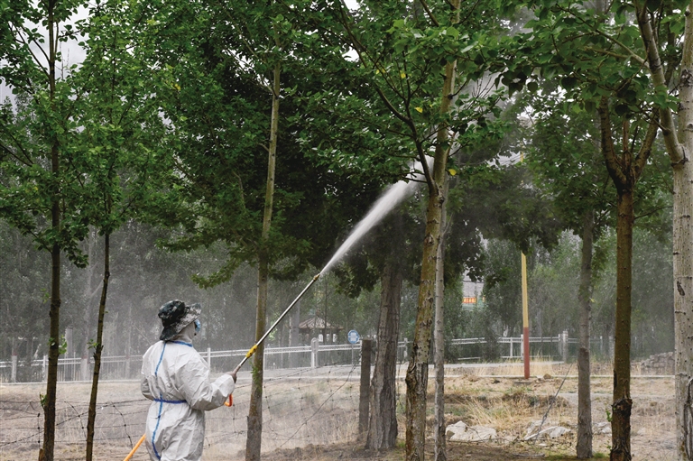 病因找到了,如何對癥下藥才是關鍵。防治隊將整片楊樹林分成三個區(qū)域,首先伐掉干死腐爛的樹,其次對病害區(qū)域進行殺菌消毒?!懊總€區(qū)域我們噴灑的藥劑也不同,主要是想對防治效果進行實驗。通過持續(xù)兩個月的觀察,發(fā)現(xiàn)第一組藥劑防治效果明顯,因此我們開始在整片楊樹林推廣第一組藥劑?!秉S敏說。