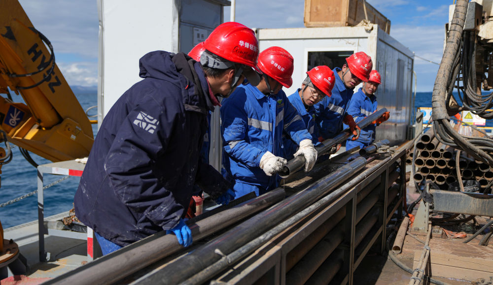 在海拔超過4700米的西藏納木錯中心湖區(qū),21名來自五湖四海的鉆探專業(yè)技術(shù)人員,全天24小時輪班奮戰(zhàn)在面積僅200平方米的水上鉆探平臺上,協(xié)助第二次青藏科考科研人員提取湖泊巖芯樣品,這些樣本如同寶貝一樣,封存著青藏高原納木錯地區(qū)百萬年來的環(huán)境氣候變化信息。 擔任這次湖泊巖芯鉆探任務的是四川資源集團華鋒鉆探隊。他們從5月31日入駐科考營地、6月6日鉆取第一批湖泊巖芯樣品以來一直奮戰(zhàn)至今。這群平均年齡31歲的鉆探隊員常年工作在高海拔地區(qū),有著豐富的鉆探經(jīng)驗,此次鉆探是他們第一次進行高海拔湖泊鉆探。目前納木錯鉆探深度突破400米,達到國內(nèi)高海拔深水大湖的鉆探新紀錄。這些鉆探隊員在見證奇跡,也在創(chuàng)造歷史。