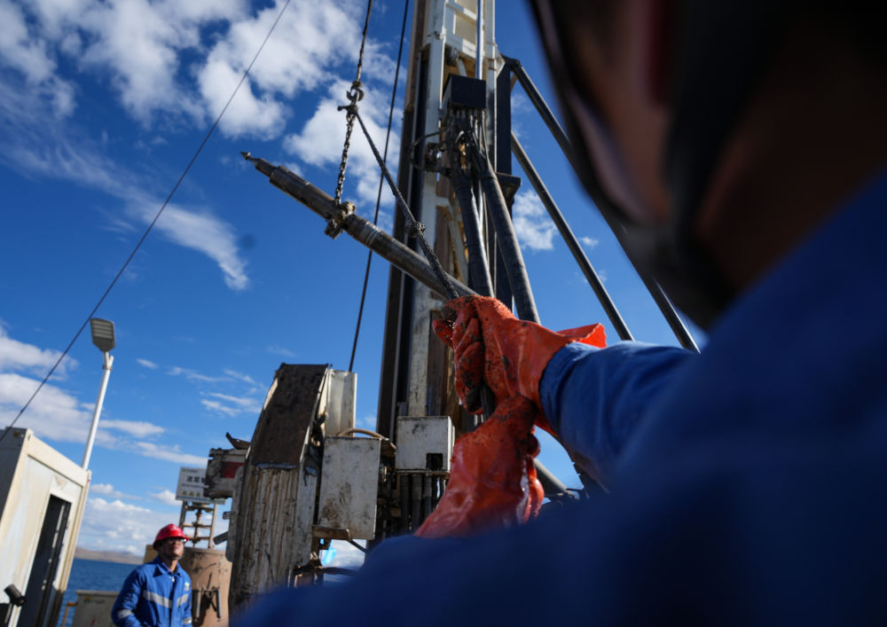 7月11日,鉆探隊員在提取湖泊巖芯。新華社記者 晉美多吉 攝