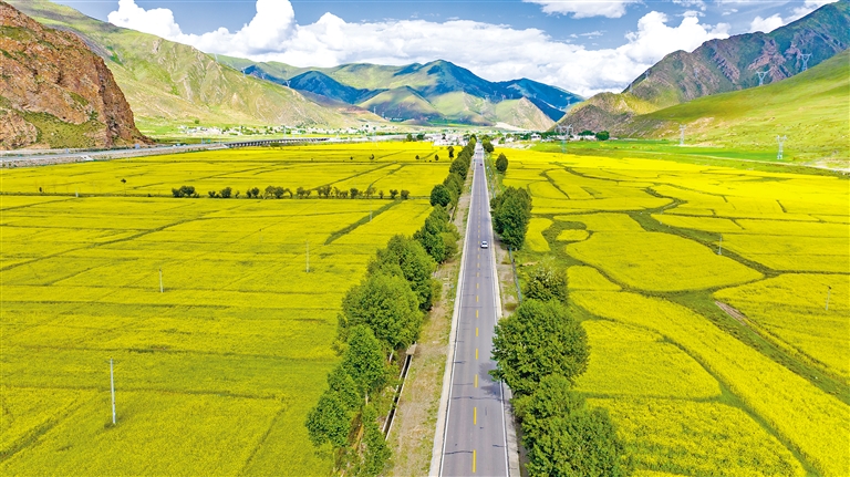 最近,墨竹工卡縣迎來(lái)了油菜花的盛開時(shí)節(jié)。放眼望去,滿目的油菜花如同金黃色的毯子般鋪展開來(lái),在微風(fēng)中搖曳,散發(fā)出迷人的香氣。一團(tuán)團(tuán)、一簇簇的金黃色花朵點(diǎn)綴在田野上,流動(dòng)著濃濃夏意。成片的花海與蜿蜒的農(nóng)村公路、錯(cuò)落有致的村居共同構(gòu)成了一幅和諧美麗的田園風(fēng)景圖。