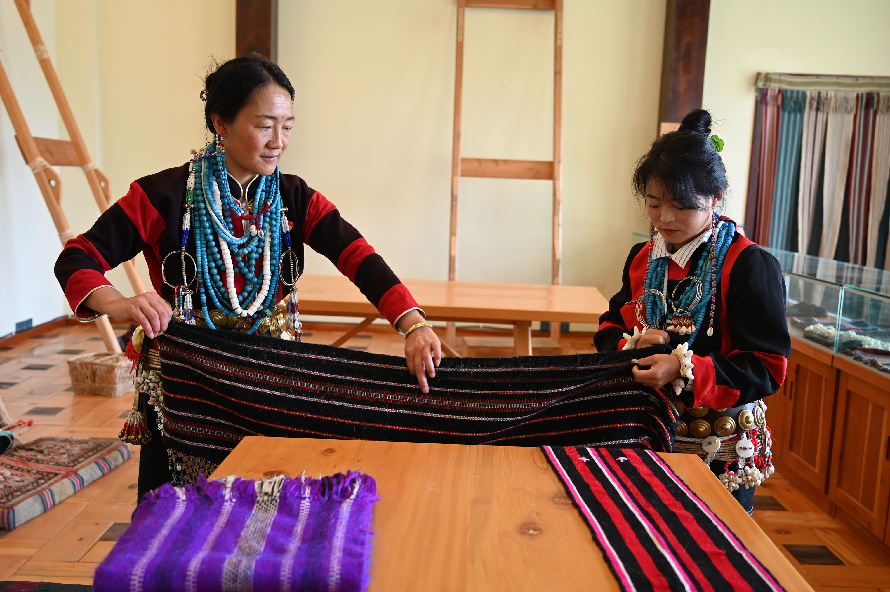 七月的林芝米林市南伊洛巴民族鄉(xiāng)才召村,干凈整潔的村道旁,家家戶戶門前的月季、玫瑰、格桑花嬌艷綻放。走進(jìn)米林珞巴族織布服飾加工傳習(xí)所,“幸福是奮斗出來的”8個(gè)紅字映入眼簾。圍巾、挎包、餐墊、毯子、珞巴服飾等10余種手工編織品有序擺放在玻璃柜里。村婦聯(lián)主席亞達(dá)兒正帶領(lǐng)7名婦女坐在織布架前編織桌旗、餐墊和毛毯等。