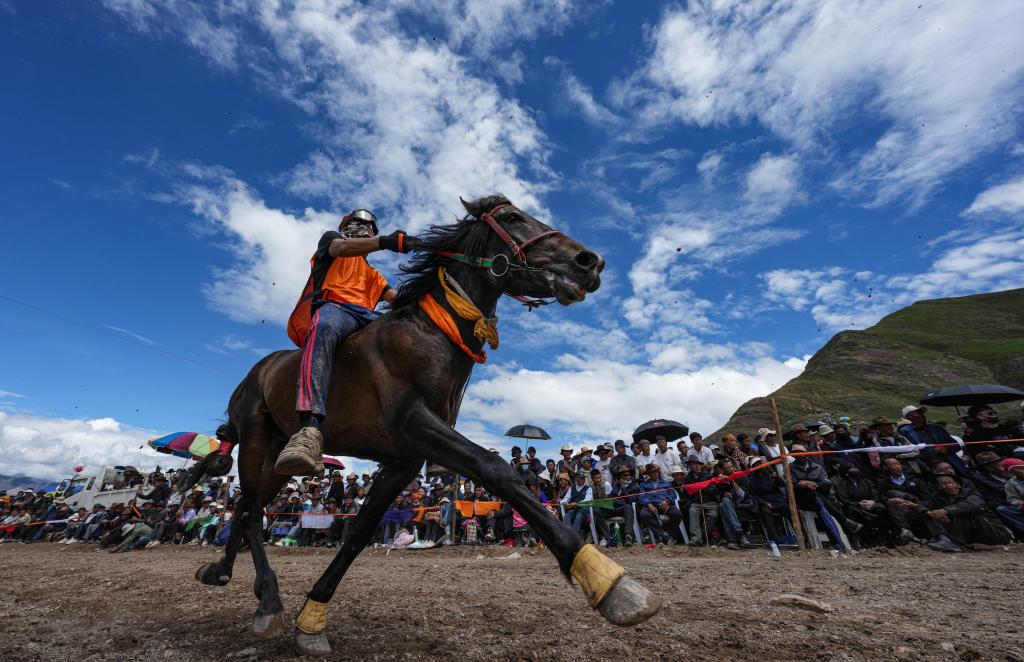 23日,在拉薩林周縣甘旦曲果鎮(zhèn)江角村的賽馬場上,選手邊瑪益丹穿著輕便的馬術運動服,上身貼緊棕色馬背,右手的馬鞭在空中打著旋,和他的愛馬進行最后沖刺。