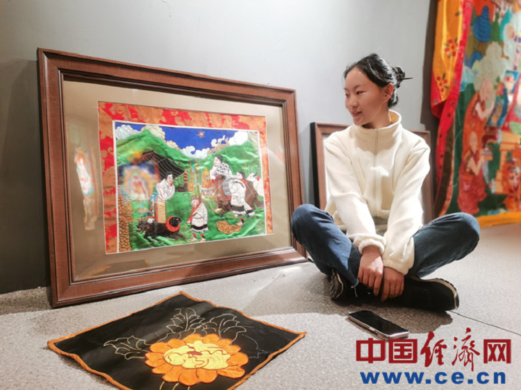 圖為巴桑德吉和她的《羌塘牧區(qū)圖》堆繡裝飾畫(huà)。 中國(guó)經(jīng)濟(jì)網(wǎng)記者魏金金/攝
