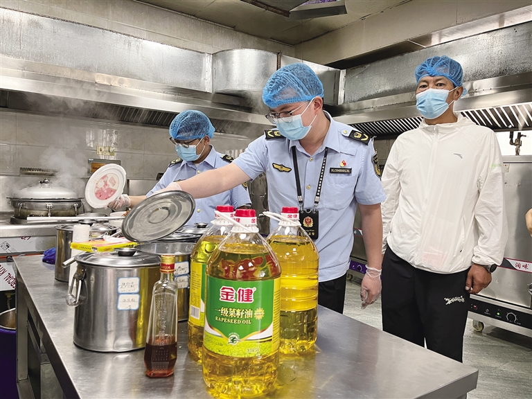 市場(chǎng)監(jiān)管部門工作人員開(kāi)展校園食品安全檢查。