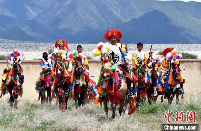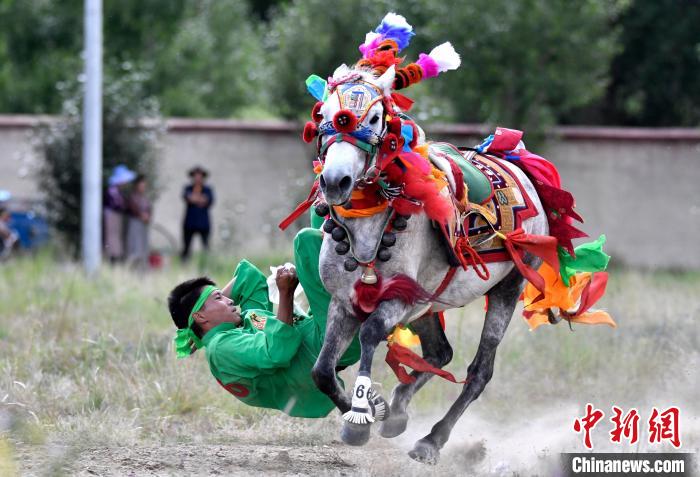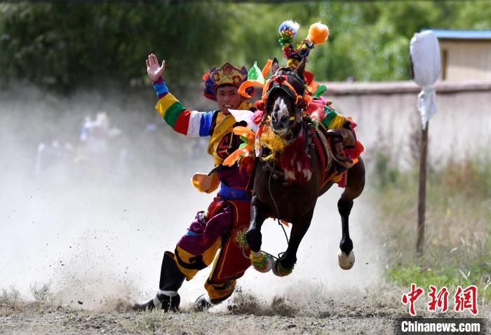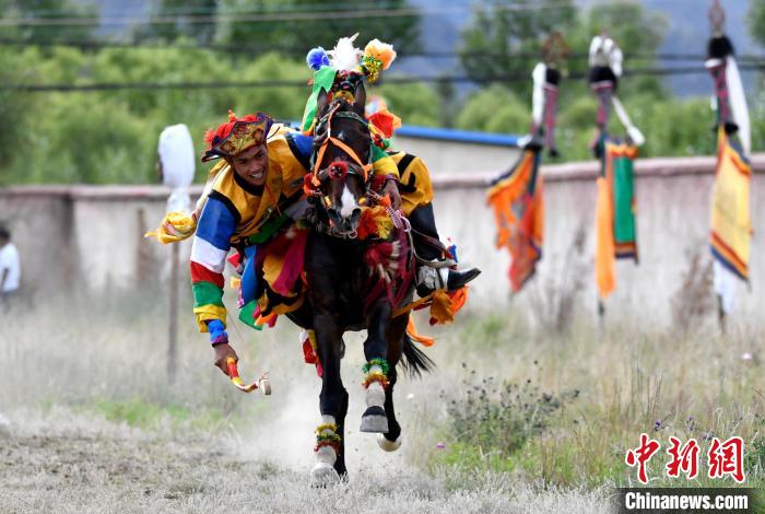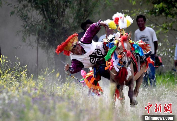 7月27日,西藏拉薩市桑達(dá)村迎來“望果節(jié)”,村民們舉行賽馬活動(dòng)慶祝?!巴?jié)”是西藏傳統(tǒng)的豐收節(jié),具體日期隨各地莊稼成熟的時(shí)間而變化。“望果節(jié)”期間,按照習(xí)俗,各地都會(huì)舉辦賽馬比賽。圖為騎手進(jìn)行馬術(shù)表演。中新社記者 李林 攝