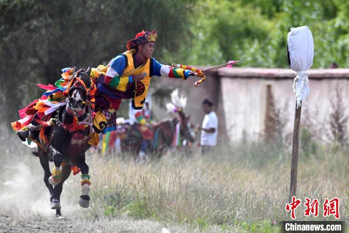 7月27日,西藏拉薩市桑達(dá)村迎來“望果節(jié)”,村民們舉行賽馬活動(dòng)慶祝?!巴?jié)”是西藏傳統(tǒng)的豐收節(jié),具體日期隨各地莊稼成熟的時(shí)間而變化?!巴?jié)”期間,按照習(xí)俗,各地都會(huì)舉辦賽馬比賽。圖為騎手進(jìn)行馬上射箭表演。中新社記者 李林 攝