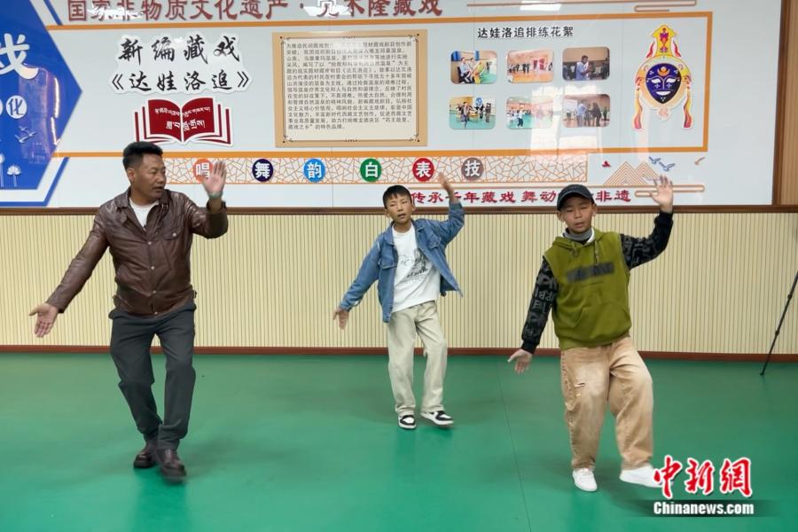 洛桑扎西現(xiàn)場(chǎng)指導(dǎo)藏戲小學(xué)員洛桑(右一)。 中新網(wǎng)記者 陳文韜 攝