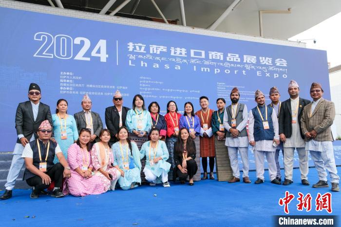 8月4日,來自尼泊爾和不丹的參展商在拉薩進口商品展覽會開幕式現(xiàn)場合影留念。中新社記者 江飛波 攝