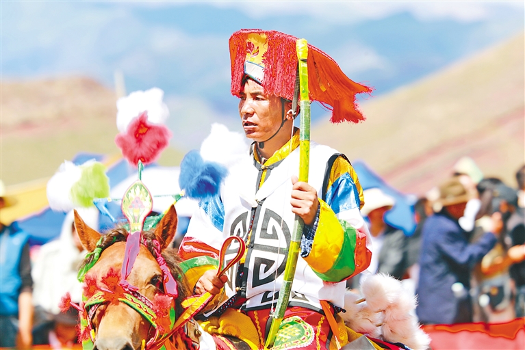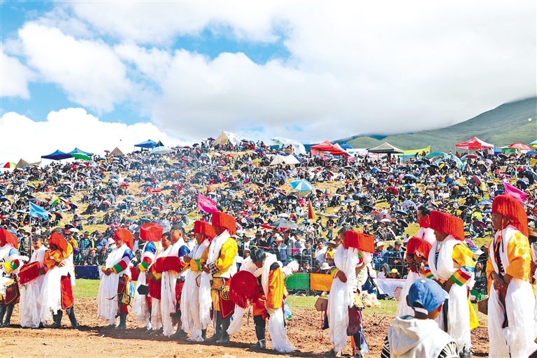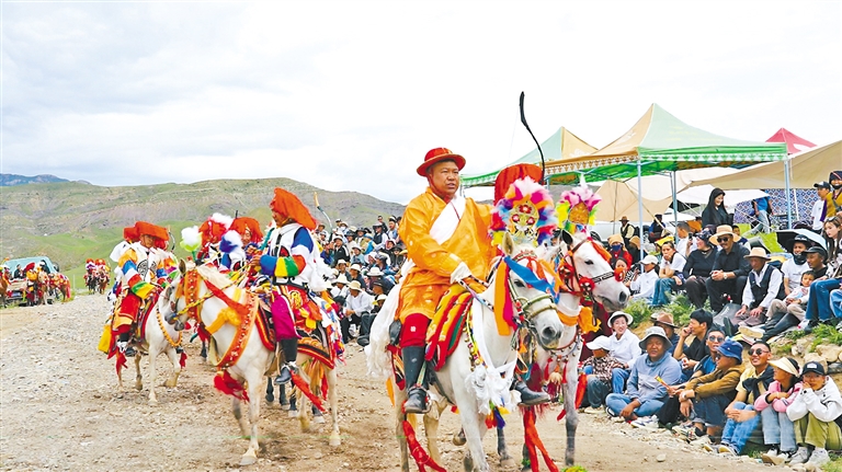 在邊交林鄉(xiāng)當杰村“望果節(jié)”活動現(xiàn)場,隨著激昂的《運動員進行曲》,當杰村“平措林望果節(jié)”活動拉開帷幕,38名馬術(shù)運動員、38名射箭運動員在2萬多名觀眾的歡呼聲中邁入現(xiàn)場。