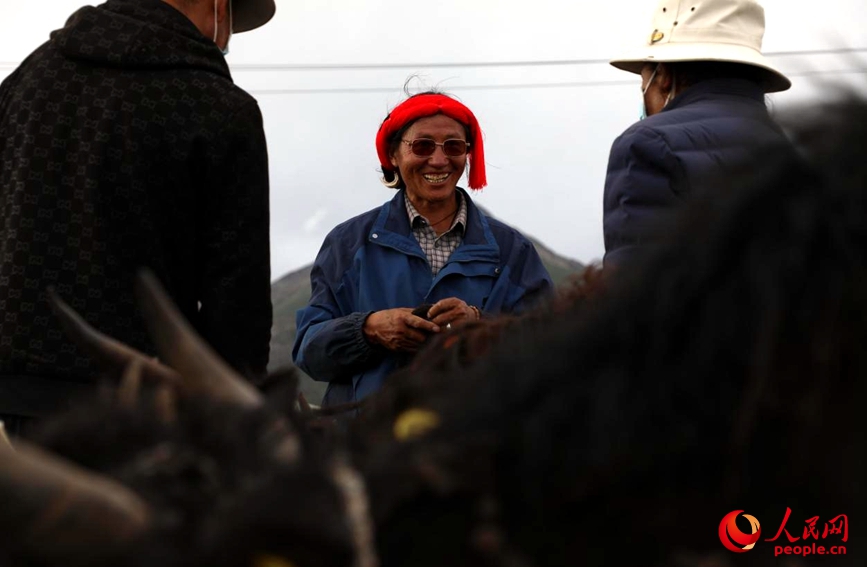 圖為當雄縣郭慶村排隊領(lǐng)取牦牛的村民。人民網(wǎng)記者 次仁羅布攝
