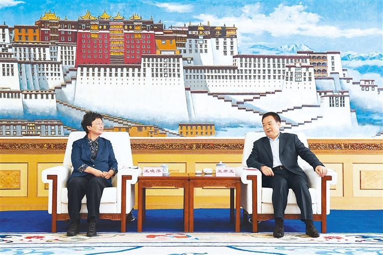 8日,自治區(qū)黨委書記王君正在拉薩與人力資源和社會保障部黨組書記、部長王曉萍一行座談。